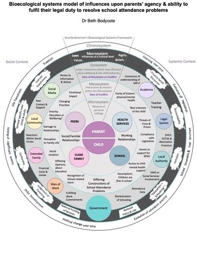 Recent research highlights the importance of holistic assessment of individual circumstances to better understand the influence of school and wider systemic factors upon cases of SAPs (e.g., Melvin et al. 2019). In this study an adapted version of Bronfenbrenner’s Bioecological Model (1979, 1998, 2005) conceptualised the social and systemic complexity of the SAPs context from the parental viewpoint. This adapted model offers a new way to understand how the successful resolution of SAPs will require multi-level changes in school attendance related discourse, practice, and policy.