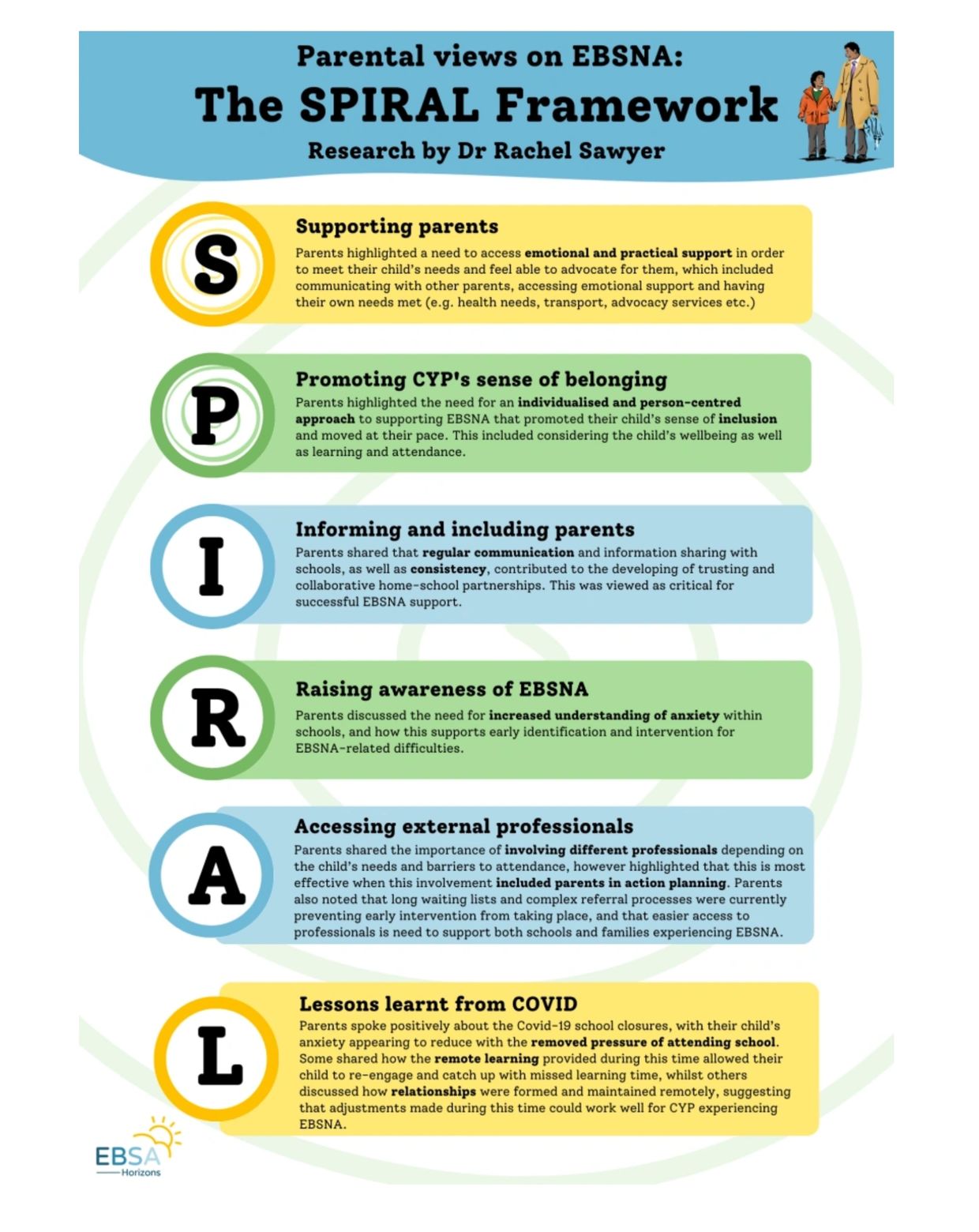 The aim of this mixed methods study was to further understand how professionals can support ‘emotionally-based school non-attendance’ (EBSNA), through exploring parental experiences. EBSNA is believed to impact one-two percent of children and young people (CYP), presenting as ‘severe emotional upset at the prospect of attending school’ (Berg et al., 1969). Adopting a ‘solution-oriented’ approach, this research gathered retrospective experiences of successful EBSNA support, aiming to uncover ‘what works’ when supporting children and families experiencing this difficulty. Furthermore, as well as understanding the support accessed by parents, and what was useful, this study additionally hoped to explore the impact of the Covid-19 pandemic on such support and determine if opportunities to learn from practices during the school closure period may exist. Participants first completed an online questionnaire (Phase One; n=28) following which descriptive statistics were produced, and content analysis techniques were employed. During Phase Two, participants completed semi-structured interviews (n=5), and transcripts were analysed using ‘Reflexive Thematic Analysis’ (Braun & Clarke, 2021). The resulting findings provides insight into the different forms of support accessed by parents when experiencing their child’s EBSNA, identifying areas of both success and improvement, as well as how lessons can be learnt from the Covid-19 pandemic. These have been presented as a framework for professional practice, named SPIRAL, which has implications for schools and local authorities in providing support to both CYP and parents experiencing EBSNA. Recommendations for future research are also discussed, informing developments across multiple systems, and highlighting the potential of the EP role.